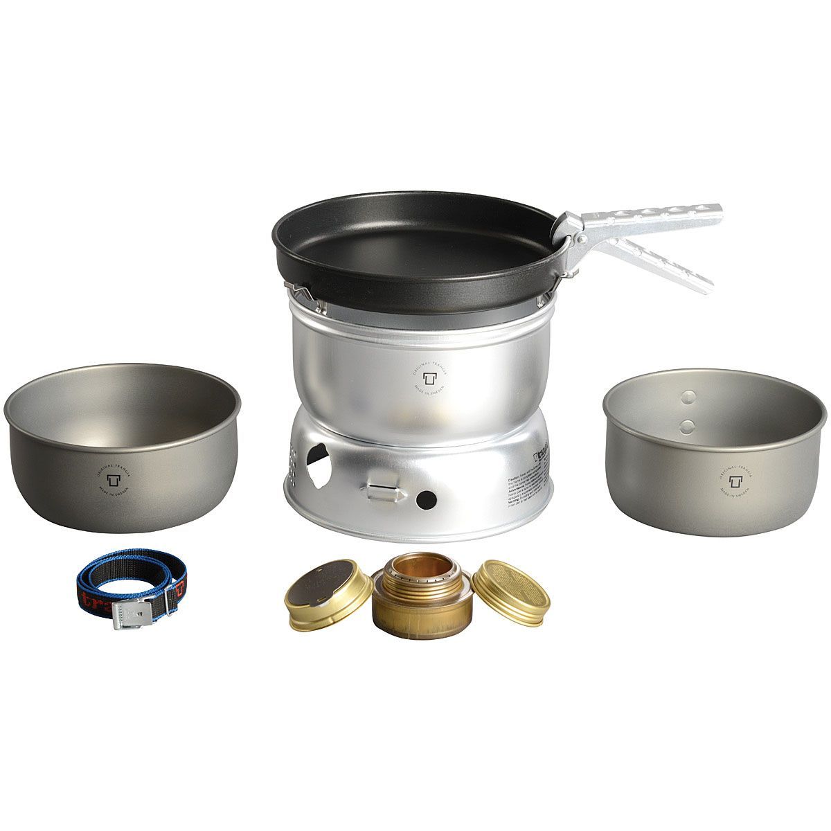 Stove with 2 ultralight hard anodized aluminum saucepans, 1 ultralight aluminum fry pan with non-stick coating, and an ultralight aluminum wind shield.