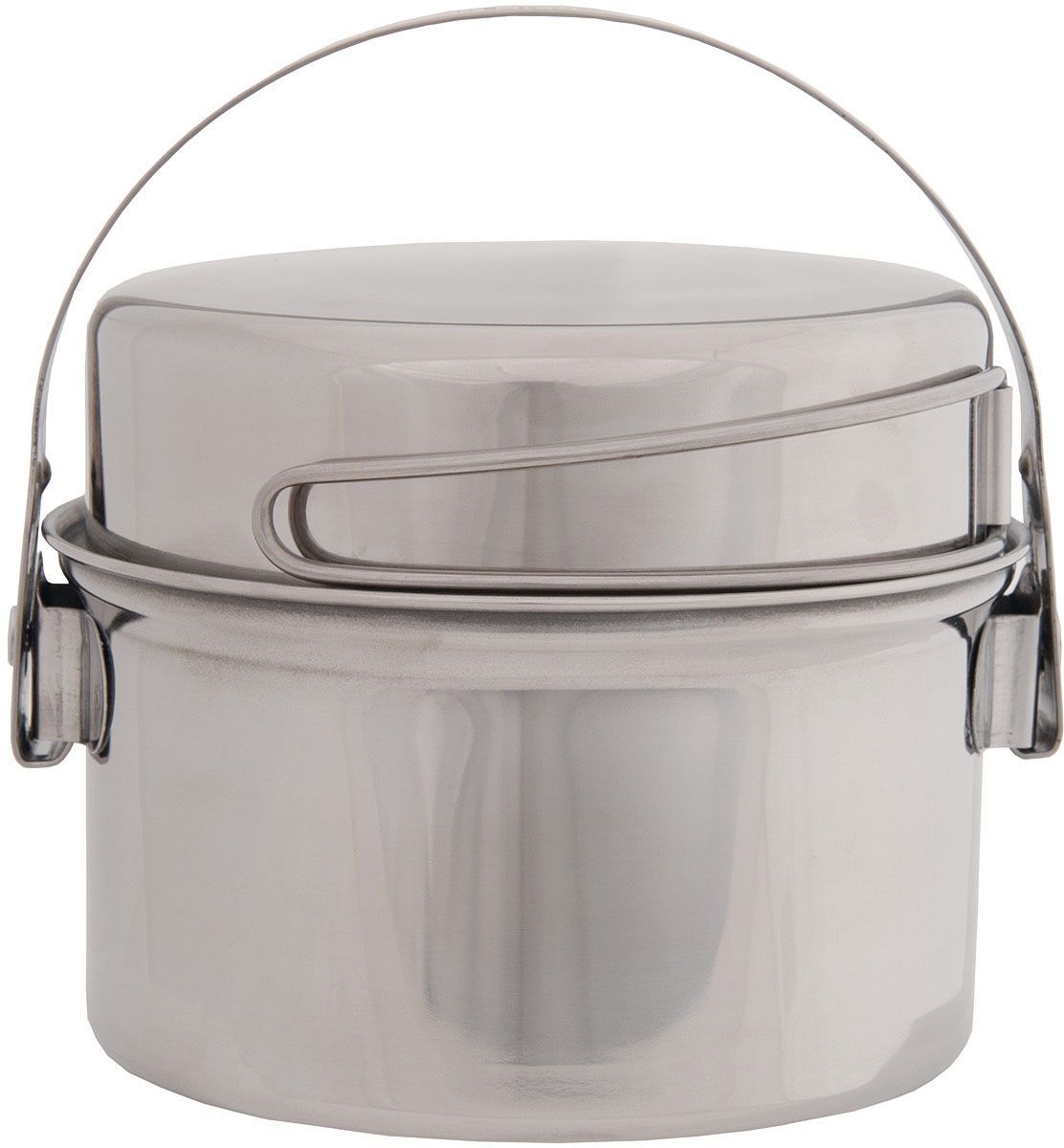 The pot lid doubles as a mini fry pan and includes its own set of flat packing handles. The handle on the pot portion has a locking bail design which secures to allow safe handling of pot contents. Made from lightweight and easy-to-clean 18/8 stainless steel giving you more time for stargazing and less time focusing on cooking and clean-up. Available in a 1 quart or in a 3 quart size.