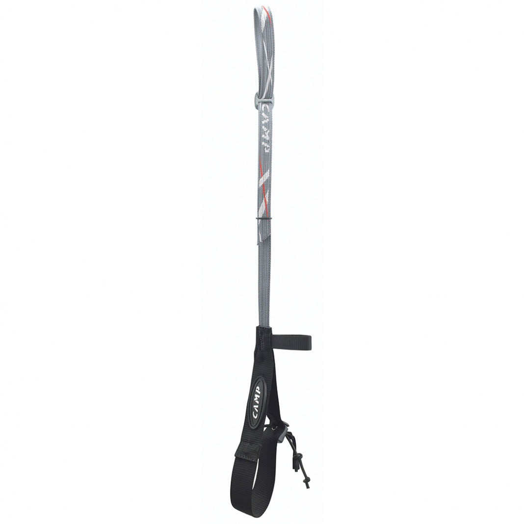 The CAMP Alpina is a technical leash designed to fit nearly any ice axe. The wrist loop quickly adjusts in size, a useful feature on climbs where you may need gloves in the morning and bare hands in the afternoon. A small loop holds your hand close to the shaft for quick retrieval but slides up when using the tool as a piolet.