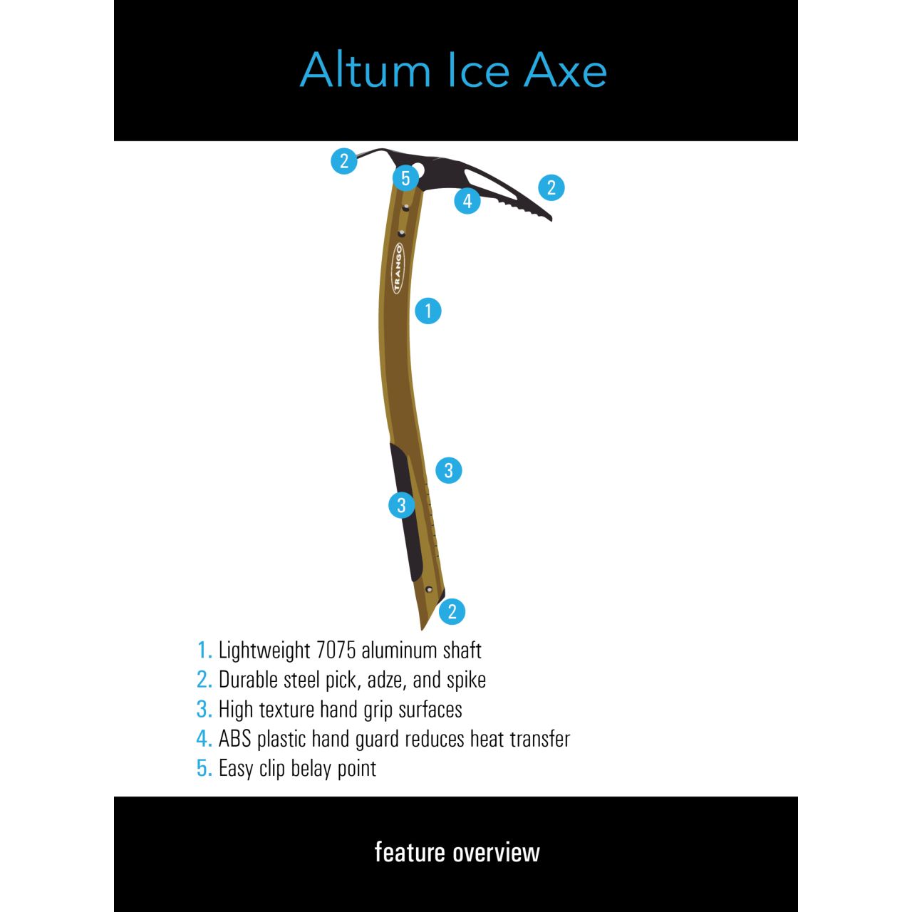 The Trango Altum is the ultimate companion for mountain expeditions where every gram matters. An aluminum shaft keeps weight down, while a steel pick allows the axe to perform when swinging into hard snow or self-arresting. A PE cover over the head minimizes heat transfer through gloves & protects the head. Available in multiple lengths to suit any type of mountain adventure.
