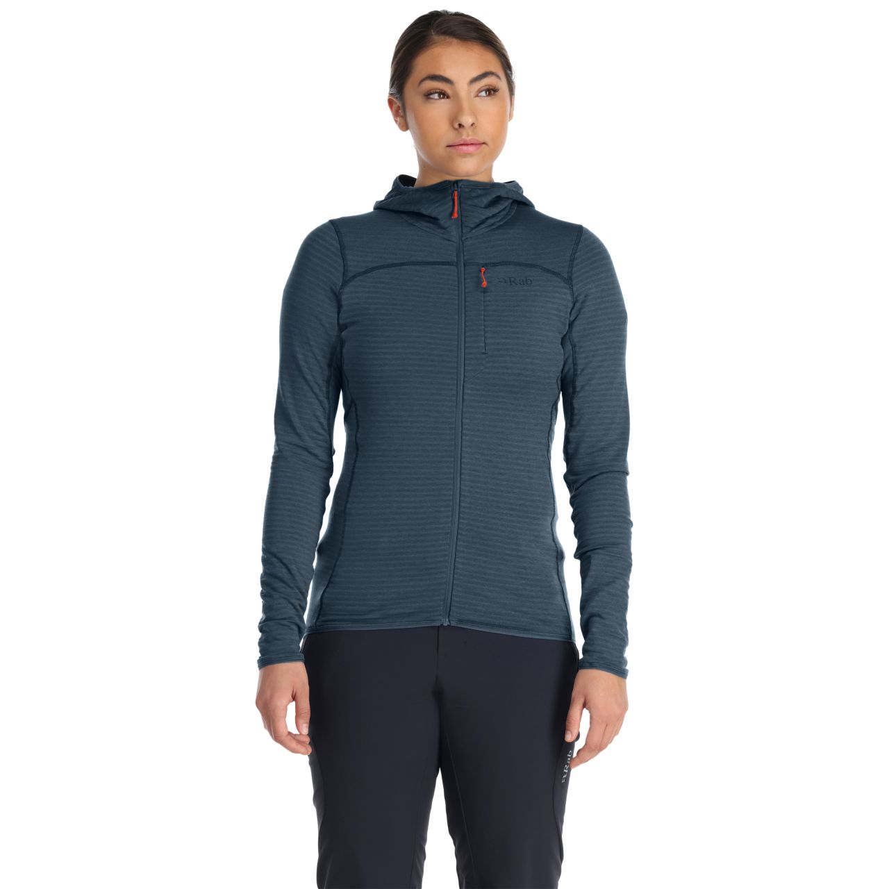 A flexible layering system is key for fast moving mountain ascents. The Rab women’s Ascendor Light Hoody is a thin and adaptable fleece midlayer, keeping you warm when you need it and wicking sweat quickly. It’s built with Thermic™ S to give you a lightweight layer that insulates and breathes very efficiently, perfect for moving fast and vertical. The under-helmet hood fits snugly around the face and offers that extra boost of warmth when the wind picks up.