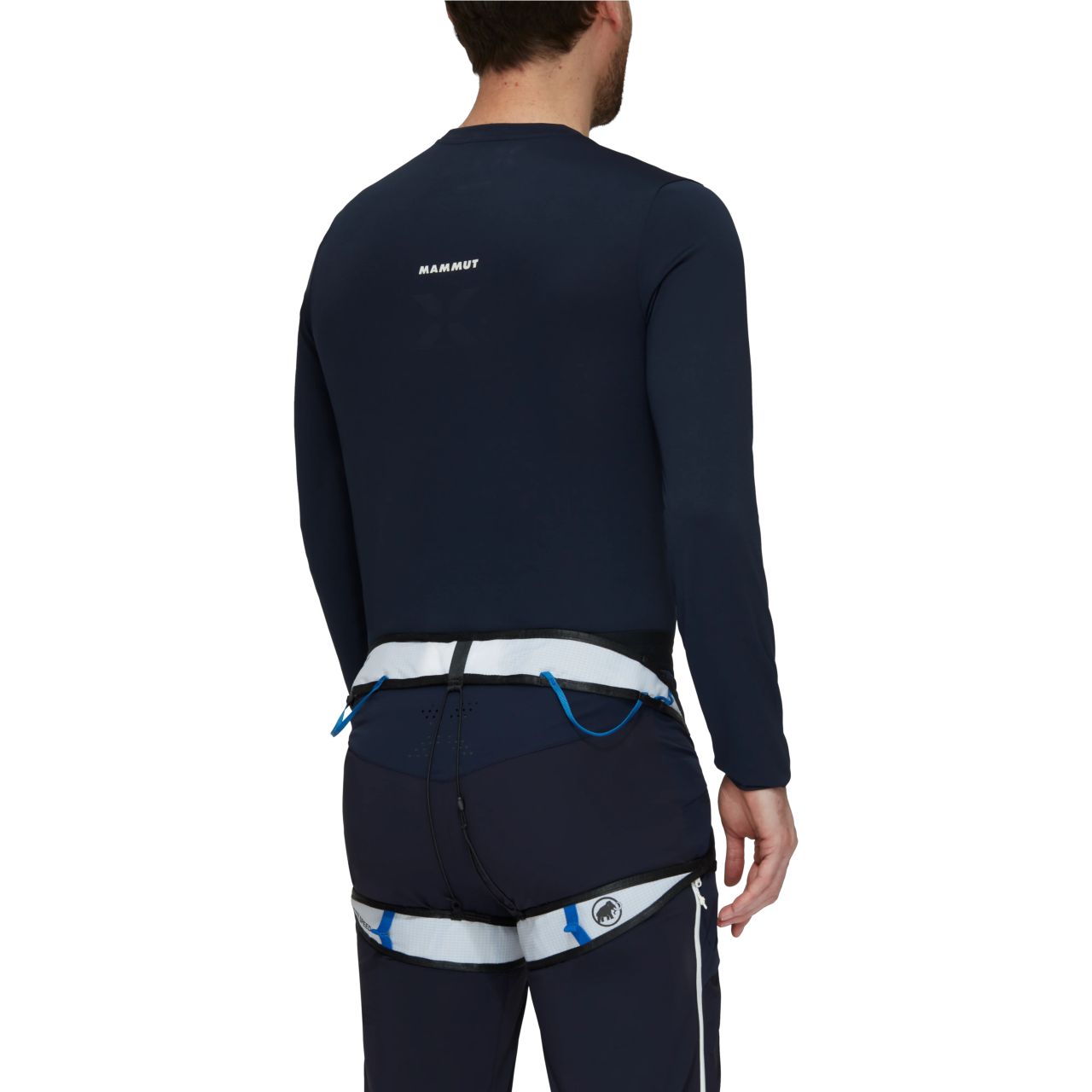 Eiger Speed: A climbing harness for when every last ounce counts, to help you reach your best-ever speeds on ski tours or mountaineering. Mammut developed this harness with Nico Hojac, an icon of speed mountaineering. It’s made from tough, completely recycled ripstop material, and has two tie-in loops and leg loops that are big enough to get into with mountaineering boots on. And there is plenty of storage space, with room for two ice-screw carabiners and two ice-screw keepers on the leg loops and gear loops. All of that at the smallest possible size and weight.