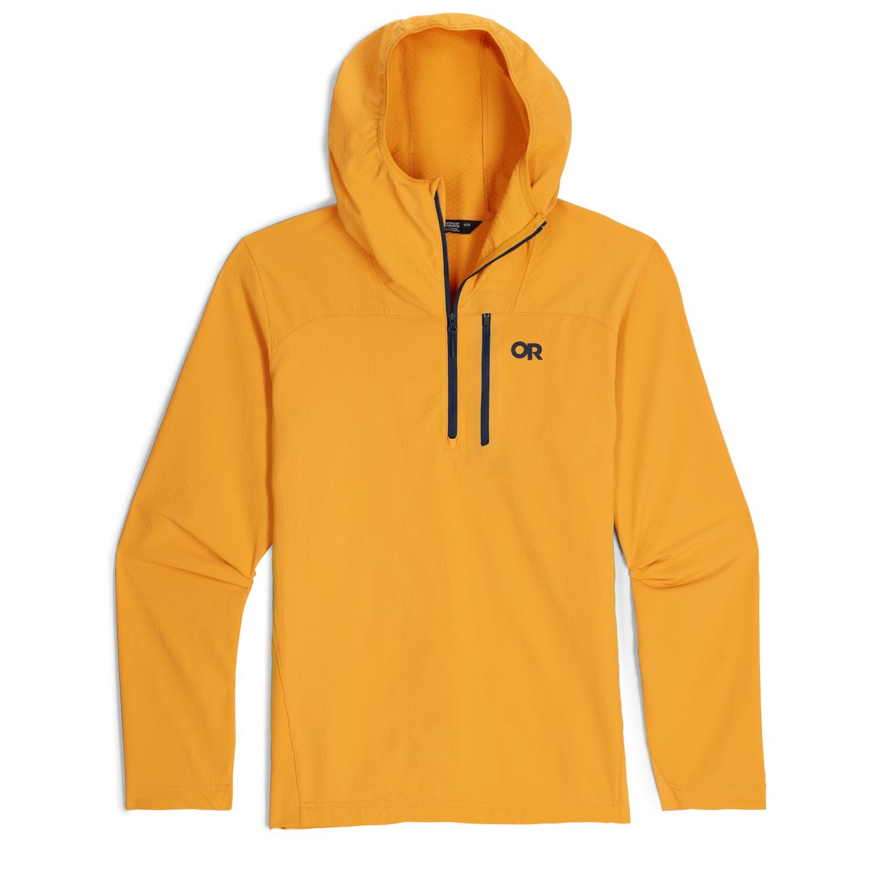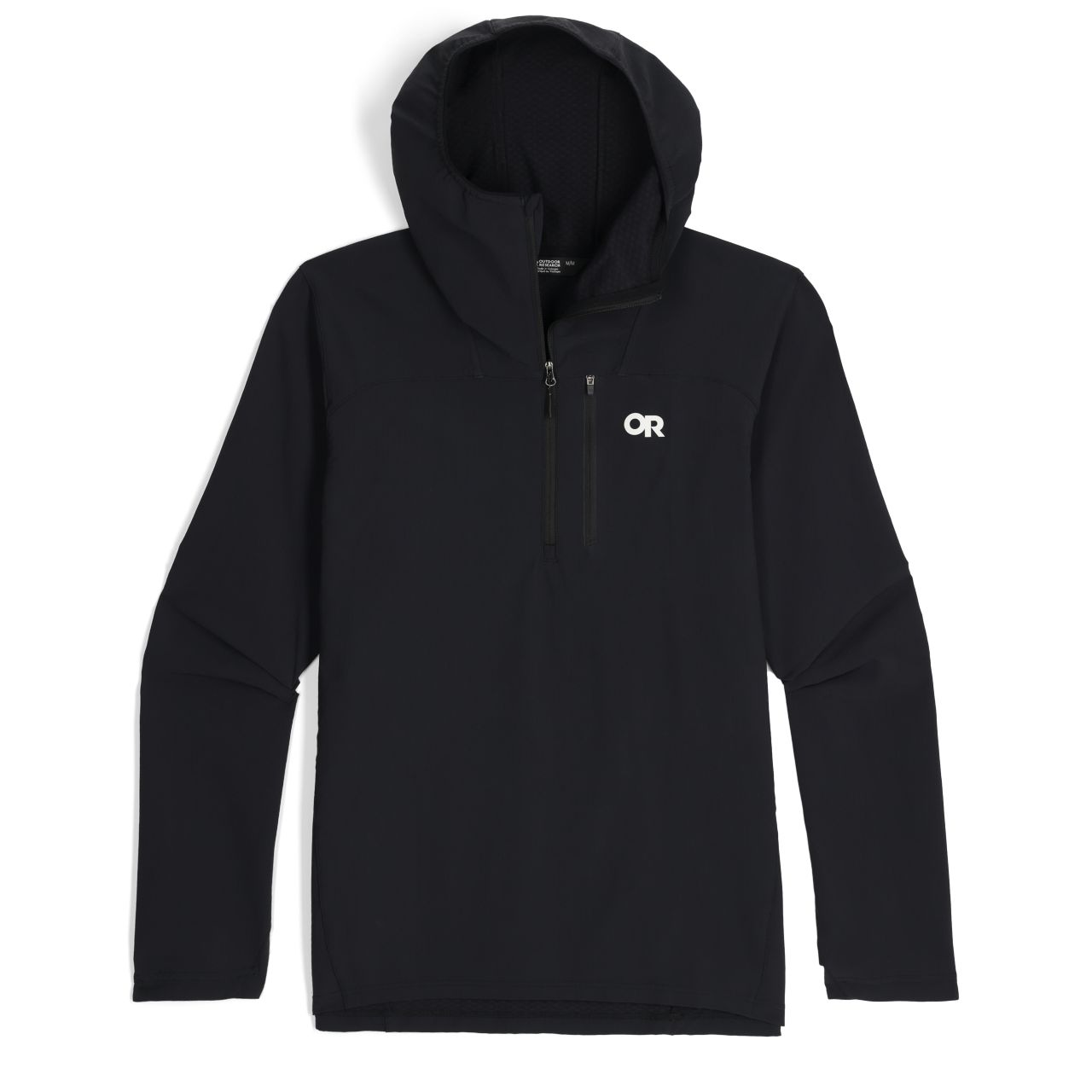 The Outdoor Research Freewheel Half Zip Hoodie is a breathable, quick-drying layer that protects against wind and moisture while logging trail or gravel miles on cool weather days. Bike-specific fit and features include a drop-tail hem, an extended front zip for easy on and off, articulated cuffs, a 3-panel hood that fits underneath a helmet, and strategically placed shoulder seams for comfortable pack wear.