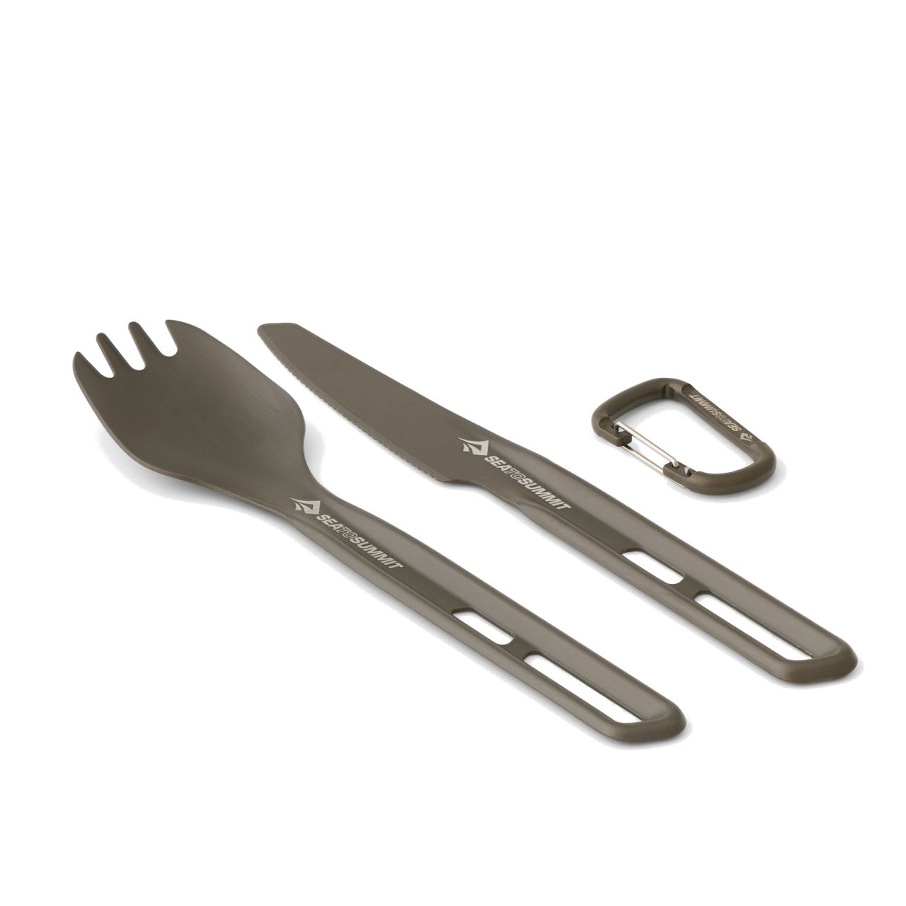 The 2-Piece Frontier Cutlery Set combines a Knife and Spork for those backcountry chefs who do more with less. Hard-anodized aircraft-grade aluminum makes these utensils as strong as they are light; Sea to Summit design makes them ergonomically functional. A mini-carabiner keeps the set clipped together when the utensils are stowed after use.