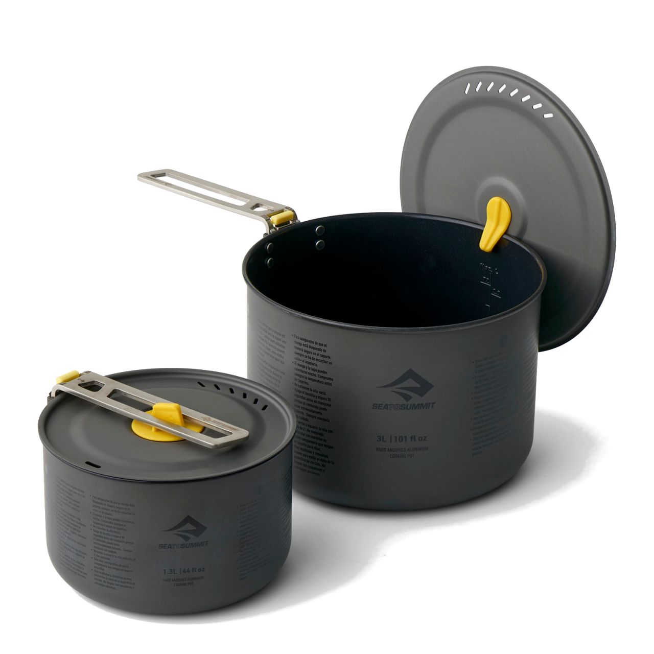 | Features | Includes a 1.3L pot and a 3L pot to provide plenty of cooking versatility in your lightweight camp kitchen setup. Hard-anodized aluminum alloy for excellent heat transfer, and ceramic non-stick coating for easy cooking and clean-up. Removable Click-Safe handle allows secure handling and can be reversed to hold the lid and nesting contents in place for storage. Lids feature an easy-to-hold grip and a patent-pending silicone rubber LidKeep to conveniently clip the lid to the rim of the pots. Sea to Summit Guarantee is offered for the lifetime of this product |