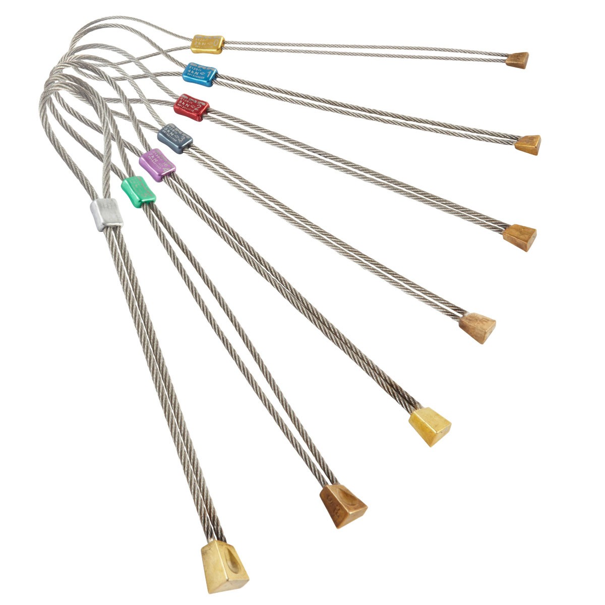 DMM HB Brass Offsets are crucial for protecting small flared cracks, often fitting perfectly where nothing else will go. The brass used for the head of the nut is soft enough to bite into placements, but hard enough to resist deforming and pulling through. Wires are soldered directly into the nut head, allowing a thicker wire to be used and increasing overall strength. The colour coded swage gives easy size selection and allows the Brass Offset to self-equalize when loaded, making the most of marginal placements.