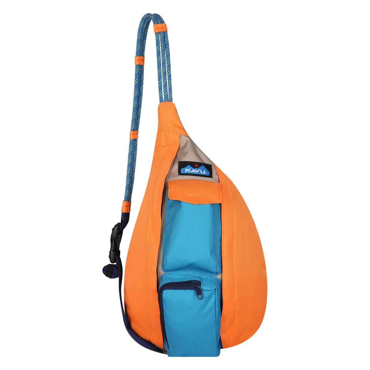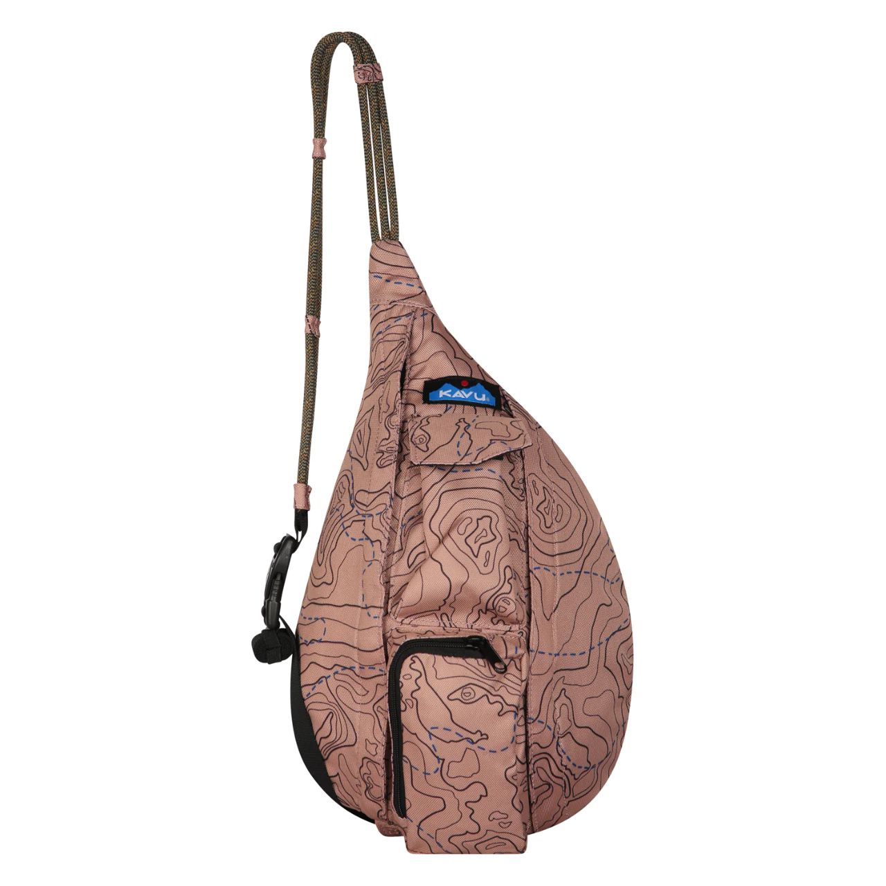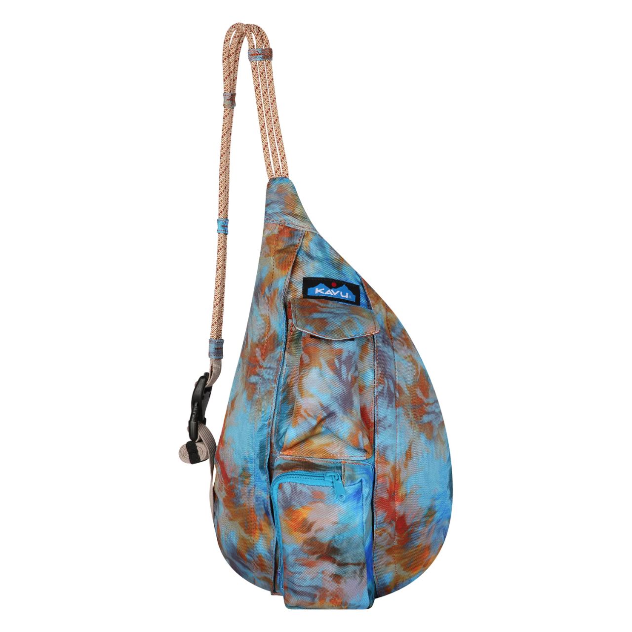 This polyester mini sling pack features an adjustable rope shoulder strap and side release buckle, two vertical zip compartments, two key or cell phone pockets, padded back with KAVU embroidery.