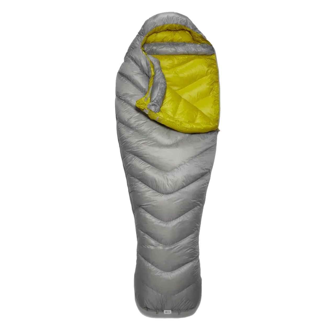 Weighing in at just 700g, it contains 400g of 900FP goose down. The chevron-style baffle design keeps the down in position, optimizing core warmth and reducing the amount of fabric needed compared to traditional horizontal baffles. The outer is made from Rab’s wind- and water-resistant recycled Atmos™ fabric. The bag has a narrow mummy shape to minimize bulk, lightweight zips and pulls, and comes with a lightweight, waterproof, roll-top compression sack for protection from the elements and a small pack size while on the move.